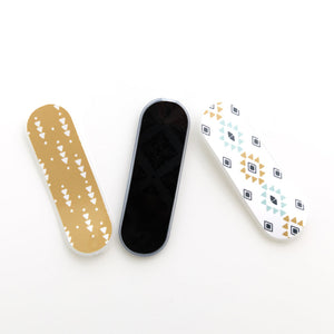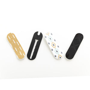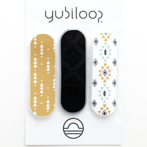The Shiloh interchangeable 3-Pack (1 Base + 3 Loops) is full of personality featuring three interchangeable loops displaying classic, neutral colors including black, white, tan, and a soft blue. Geometric shapes, triangles, diamonds, complimented with a black linen solid (updated black loop design).