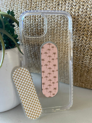 The Isla is a darling addition to any phone with its gold palms on a pale pink backdrop , paired with a second strap with a whimsical checkerboard pattern . If you love all things beachy, you’ll love this special addition to our women’s collection.